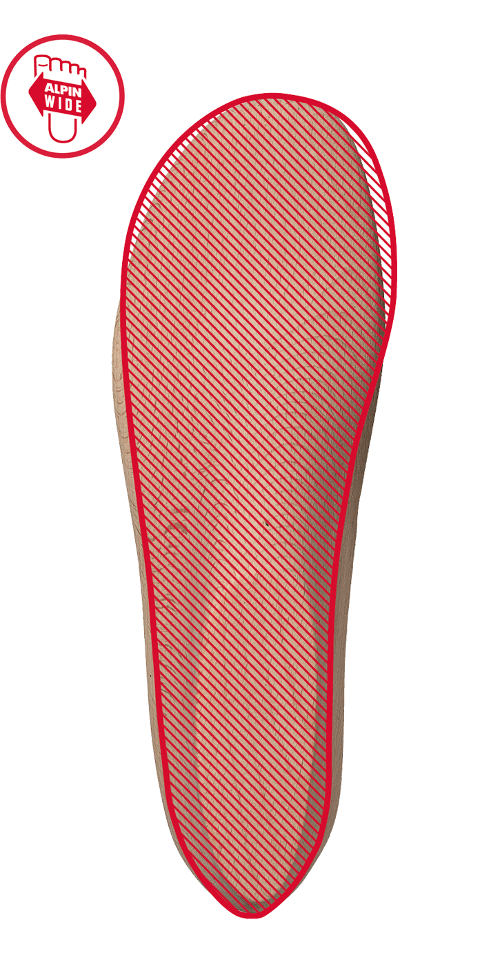 Hanwag Alpine Wide: ze względu na wymagania techniczne buty z grupy ALPINE mają nieco węższy kształt. Jednak nasz AlpineWide Last zapewnia szerszy obszar przedniej części stopy. Zmniejszając nacisk w obszarze palców, zmniejsza się ryzyko odmrożeń i pozwala nosić grubsze skarpetki.