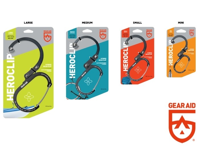 Gear Aid Heroclip dostępny jest w czterech rozmiarach (Mini, Small, Medium, Large), co pozwala dopasować go do różnych zastosowań – od lekkich akcesoriów po cięższy sprzęt outdoorowy*.