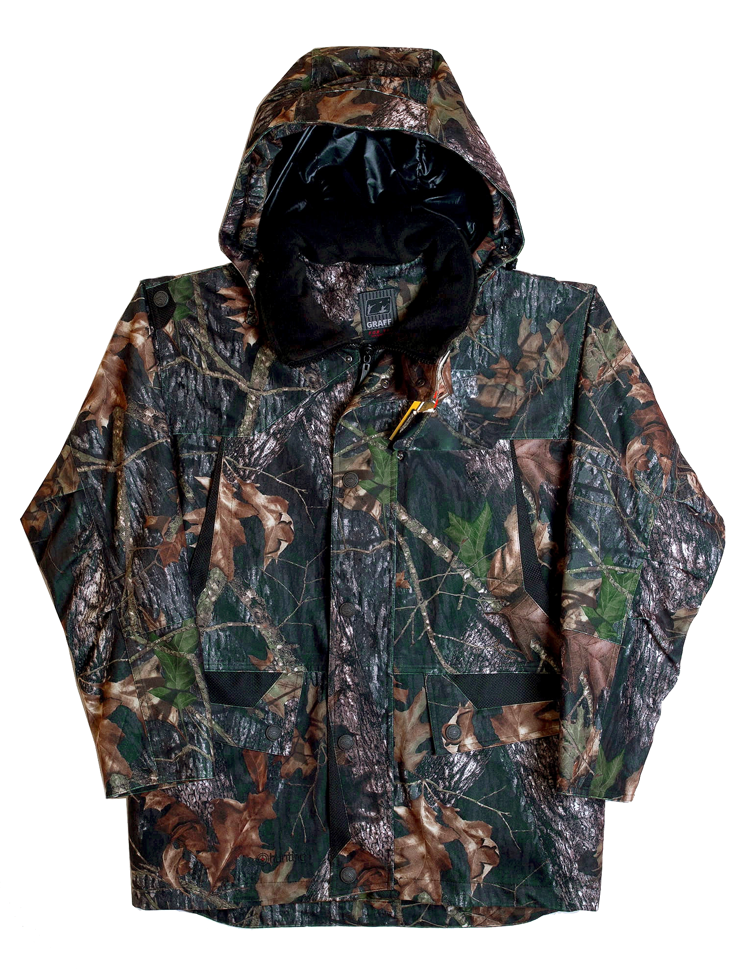 Graff 643-B-L to wytrzymała kurtka terenowa stworzona z tkaniny BRATEX® oraz miękkiego w dotyku zamszu, który nie szeleści podczas ruchu. Dzięki klejonym szwom i odporności materiału na rozerwania, model doskonale sprawdza się w wymagających warunkach. Zaszewki w ramionach i łokciach oraz system zakładek w rękawach zwiększają swobodę poruszania się, a kołnierz wyłożony polarem podnosi komfort termiczny. Odpinany kaptur został wyposażony w moskitierę, która chroni przed owadami, a zastosowana powłoka TEFLON® dodatkowo zabezpiecza przed deszczem i niekorzystnymi warunkami atmosferycznymi. Kurtka w kolorze kamuflażu „las” pozwala wtopić się w otoczenie, co czyni ją idealnym wyborem do polowania i innych aktywności w terenie.